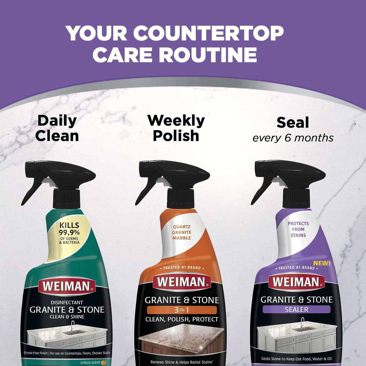 HOW TO USE WEIMAN STONE CARE PRODUCTS: To maintain the beauty of your granite, quartz, marble, tile, limestone, or slate surfaces, we recommend using our Daily Cleaner for everyday messes & clean up. On a weekly basis, use our 3-1 Granite & Stone Polish and Protect Spray, and finally our Granite & Stone Sealer as needed based on your stone. Generally, 1-2 applications of sealer, when used as directed, every 6 months will keep your countertops and surfaces stain-free and looking their best!